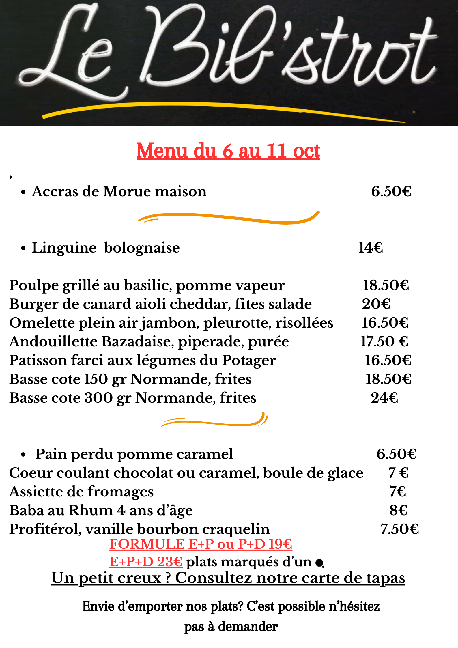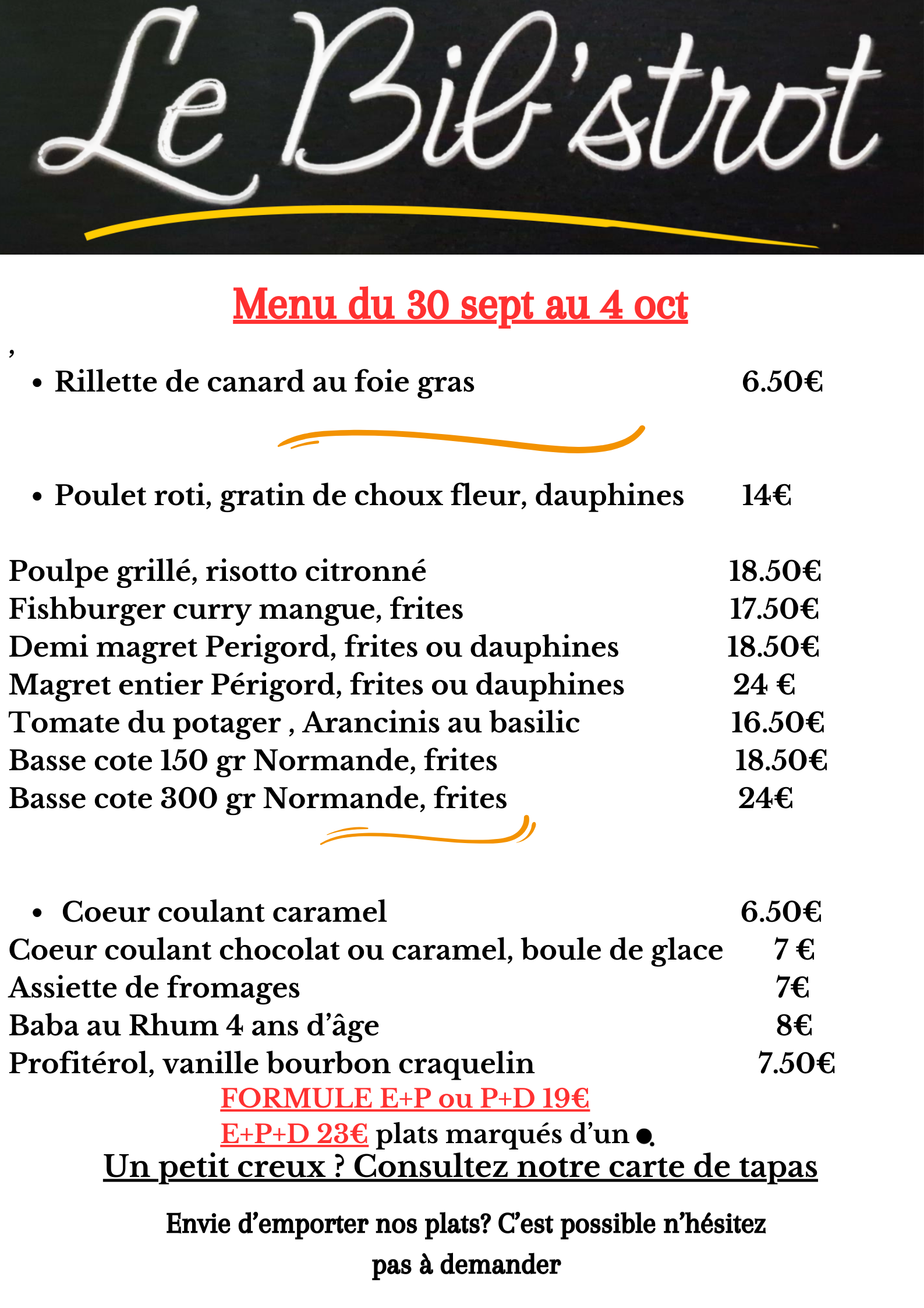 Vous pouvez vous garer simplement devant le bistrot sur notre parking sans frais. Notre bistrot est équipé pour accueillir les personnes à mobilité réduite. Vous pouvez emmener vos animaux de compagnie dans notre restaurant. Contactez-nous et réservez dès aujourd’hui. Utilisez simplement notre formulaire de réservation en ligne. Nous serions aussi heureux de recevoir votre réservation par téléphone au +33556401902. Vous pouvez payer par paiement sans contact, carte Maestro, MasterCard, carte de débit, Apple Pay, Ticket Restaurant®, tickets repas ou carte VISA. Bien évidemment, nous acceptons aussi les paiements en espèces. Nous pouvons aussi vous préparer vos plats à emporter. Les festivités privées sont possibles pour nous – contactez-nous pour en savoir plus. Nous sommes ouverts tous les jours sauf le samedi et le dimanche.